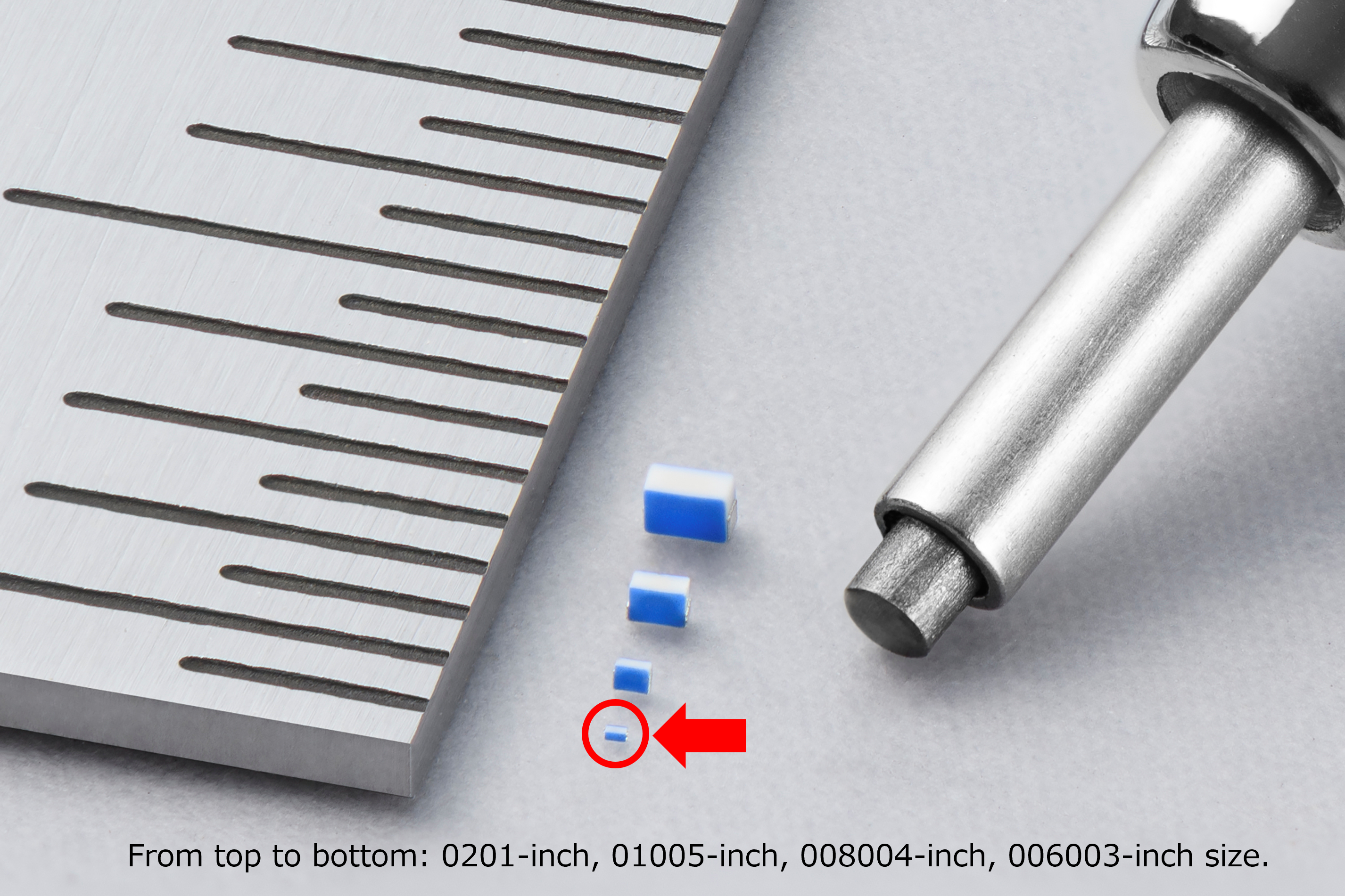 為了滿足這些需求,村田迄今為止透過整合自有的核心技術,在貼片尺寸小型化領域一直保持技術領先。此次,村田在2024年9月發表了超小型多層陶瓷電容器新品之後,又開始開發016008尺寸的片狀電感器,並已成功完成了試製。相較現有產品0201尺寸(0.25mm×0.125mm),體積可縮小約75%。