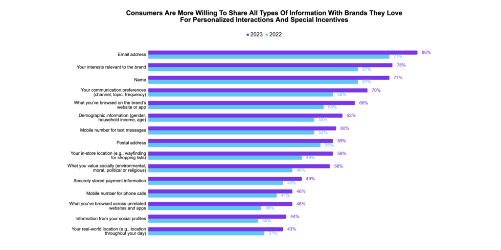 消費者最願意分享的前五種資訊包括「他們的溝通偏好」和「他們在品牌應用程式或網站上瀏覽過的內容」,突顯出以客戶為中心的品牌互動的重要性。實際上,在消費者願意分享的資訊中,年增率增長最顯著的是「他們在社會層面看重什麼(環境、道德、政治或宗教)」。