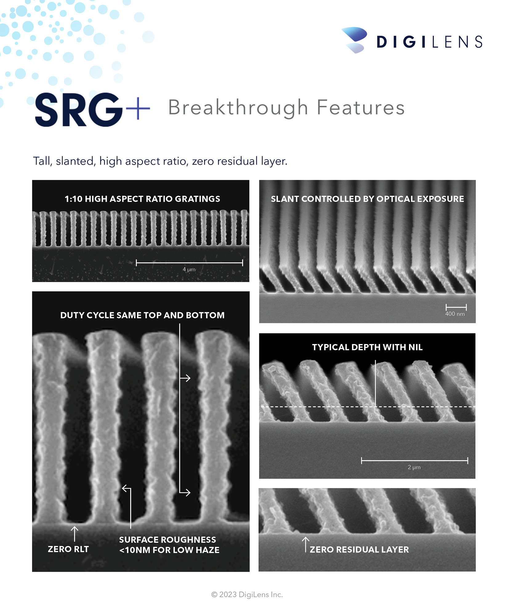 “借助 SRG+,我們已經解決了與傳統表面浮雕光柵相關的挑戰,例如那些由 NIL 技術製造的光柵,達到了前所未有的許多微米的結構高度和超過 10:1 的縱橫比,同時保留支撐 DigiLens 技術的低成本製造方法。”DigiLens Inc. 光學工程高級副總裁 Alastair Grant 說道。