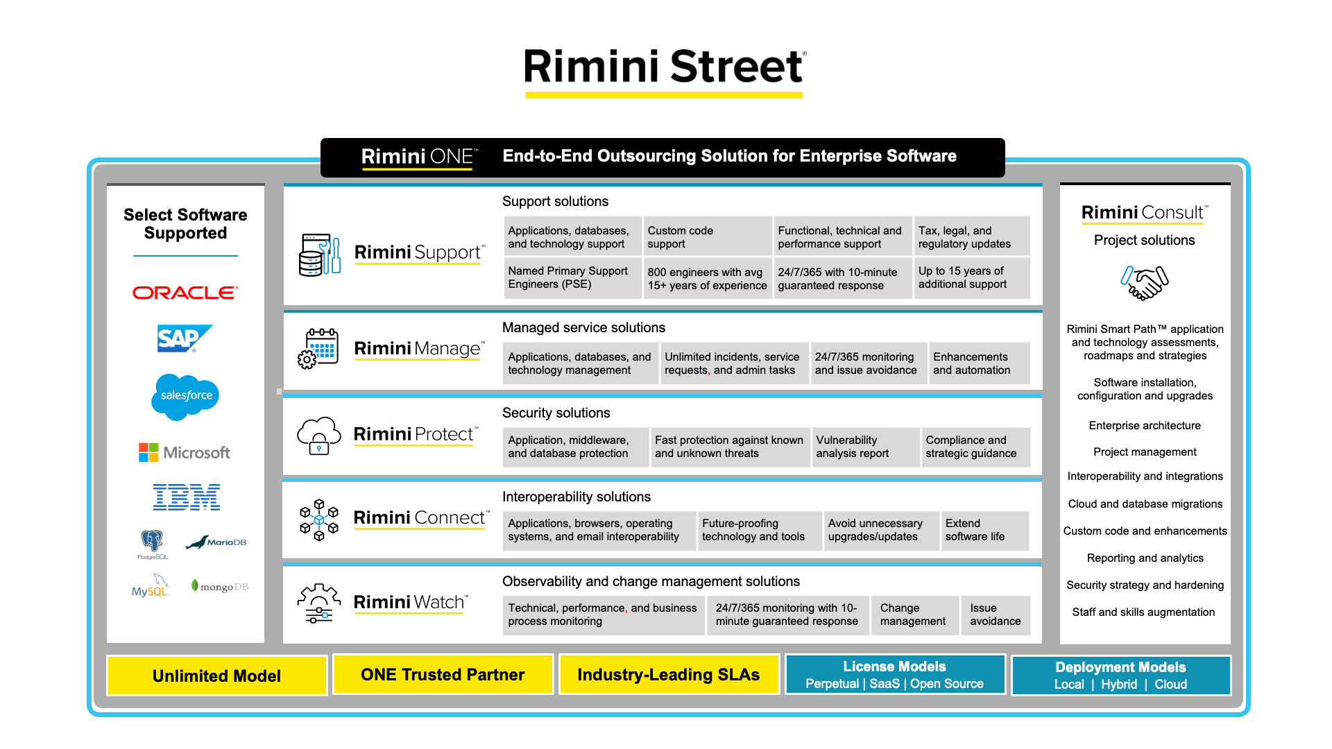 Rimini ONE匯集了Rimini Street擴大後的全套支援、產品和服務,適用於SAP、甲骨文電子商務套件(Oracle E-Business Suite)、PeopleSoft、Siebel、JD Edwards,以及其他企業應用軟體、專有和開源資料庫及科技軟體,如中介軟體、整合、安全、資料倉庫/資料湖、人工智慧、報告和分析等。